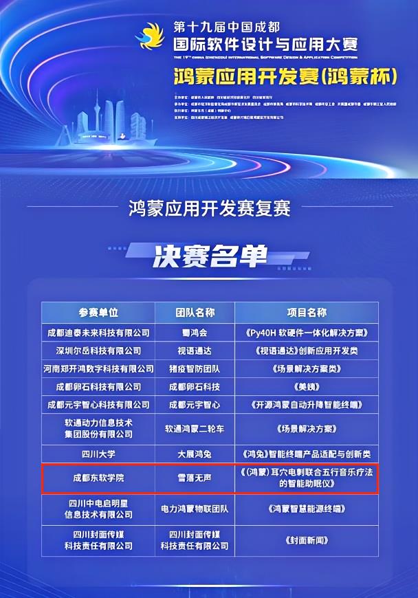 在本次大赛中,成都东软学院跨学院学生团队完成的《(鸿蒙)耳穴电刺联合五行音乐疗法的智能助眠仪》项目,从硬件设计到系统开发实现全链条技术贯通。该项目围绕耳穴电刺精准性与设备便携性开展硬件研发,团队参考中医典籍完成耳穴定位与硬件选型,平衡佩戴舒适性与刺激有效性。在应用层开发中,团队基于鸿蒙系统“一次开发、多端部署”特性,实现手机端与助眠仪的高效连接,并开发睡眠监测与五行音乐疗法的联动功能,支持用户根据睡眠数据调节电刺强度与音乐节奏。