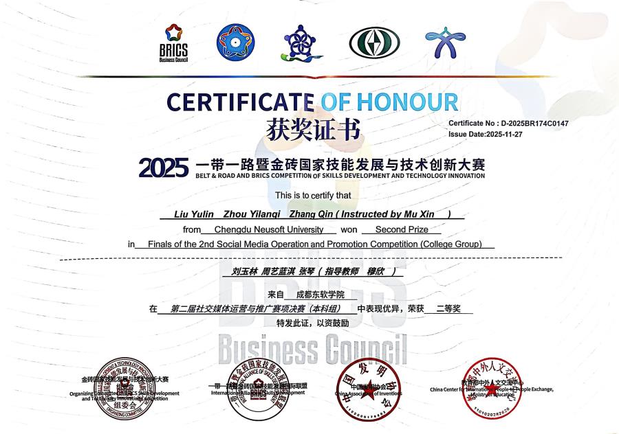 近日,2025“一带一路”暨金砖国家技能发展与技术创新大赛第二届社交媒体运营与推广大赛全国总决赛圆满落幕。我校信息与商务管理学院学生团队表现优异,凭借扎实的专业技能与独特的创新思维脱颖而出,荣获全国二等奖。学校获得“优秀组织奖”。
