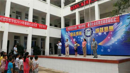 2014年7月31日,成都东软学院暑期“三下乡”社会实践活动暨资阳市2014年“快乐学校”暑期社会实践活动启动仪式在简阳市平息乡九义校举行。资阳市关工委秘书长尹英,中共简阳市委常委、市总工会主席顾晓玲,成都东软学院团委书记、学工部副部长蒋利明,简阳市平息乡党委书记陈正良,九义校领导和学院志愿者参加启动仪式,仪式由简阳市团委副书记傅海峰主持。