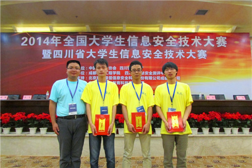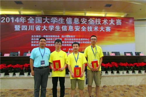 学院代表队由计科系信息安全专业教师周让老师带队,信息安全技术专业12级的邱浩原、蒲梦涛、刘元杰组成了成都东软学院1队、13级的温世民、余晓东、邓力同学组成了成都东软学院2队参加了比赛。最终,成都东软学院2队以全国总分第4名和四川省总分第3名的优异成绩荣获一等奖,成都东软1队荣获三等奖,成都东软学院荣获优秀组织奖,周让老师获优秀指导教师奖。