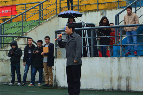 学院质量部部长程学良简要介绍了12·9运动并宣读了长跑比赛规则,他强调在雨中比赛更要注意安全,友谊第一,比赛第二。