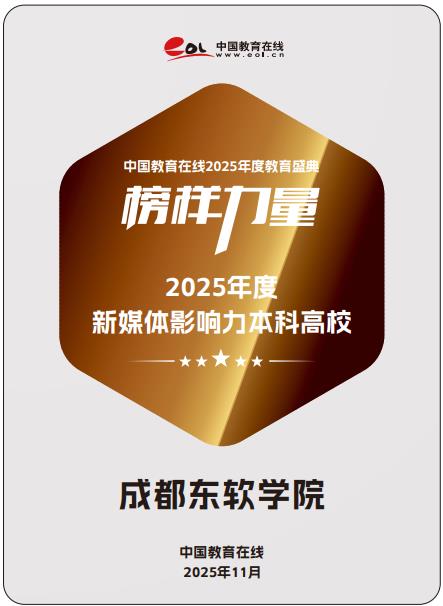 近日,中国教育在线“榜样力量·2025年度教育盛典”优秀案例公示。成都东软学院凭借在新媒体领域的卓越成就与深远影响力,荣获 “2025年度新媒体影响力本科高校”。
