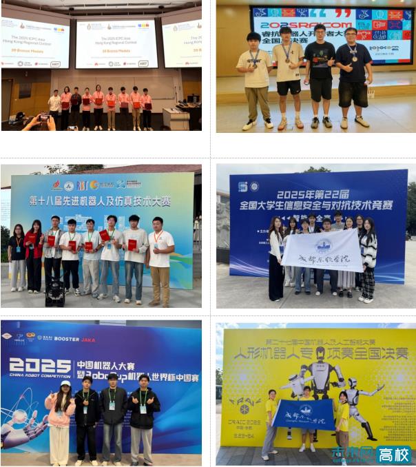 特色融合夯实根基,竞赛成果赋能专业建设。亮眼的学科竞赛成绩,是学校将学科专业优势转化为应用型人才培养实效的生动实践。学校依托在人工智能与数智化领域的学科专业优势,积极对接区域经济发展需求,在国产软件应用、信息安全、机器人等优势专业赛道持续发力,推动专业能力向竞赛核心竞争力转化。2025年,学校在机器人大赛、软件和信息技术专业人才大赛、华为ICT大赛、计算机设计大赛、人工智能大赛等赛事中累计获奖650余人次。同时,学校积极推进学科专业交叉融合,在各类细分赛道中持续突破,形成特色鲜明的竞赛格局。从年度竞赛排名来看,学校在计算机类、机器人、艺术与设计等专业领域竞赛指数中位居全省前列,其中计算机类竞赛指数稳居四川省民办高校首位,位列全国高校前12%,跻身全国民办高校前三。一系列成绩的取得,充分体现了学科竞赛与专业教育、创新教育的深度融合,有力推动了专业内涵建设与人才培养质量的双提升。